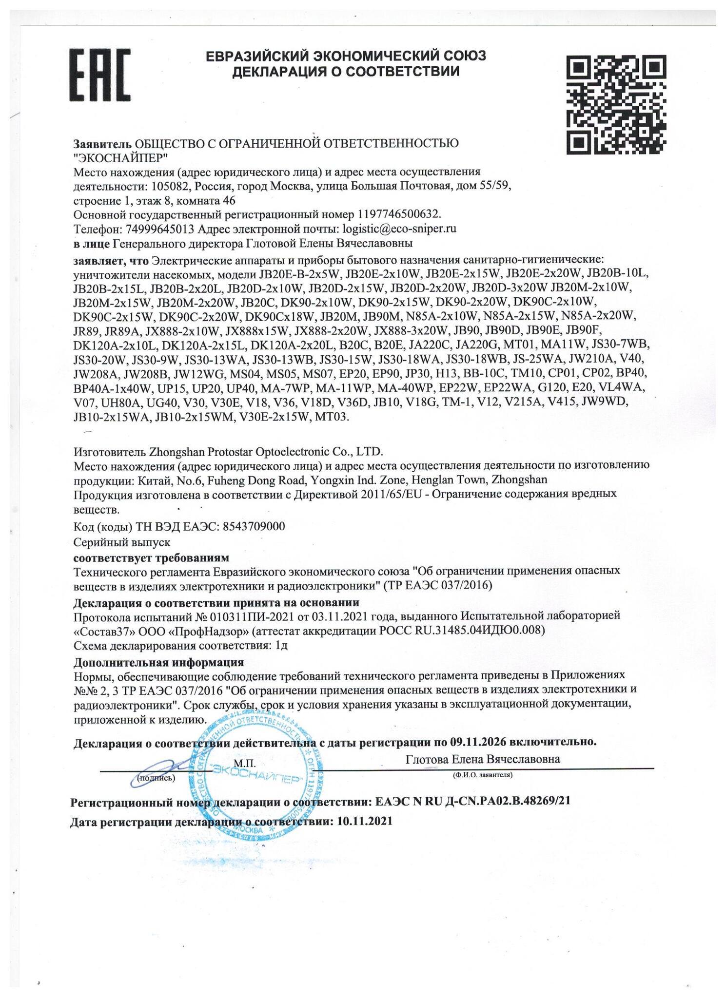Купить лампу от комаров "Экоснайпер JB20B-2х20L" по выгодной цене в Лесном очень просто: для этого достаточно оставить заявку нашим операторам по телефону или email.